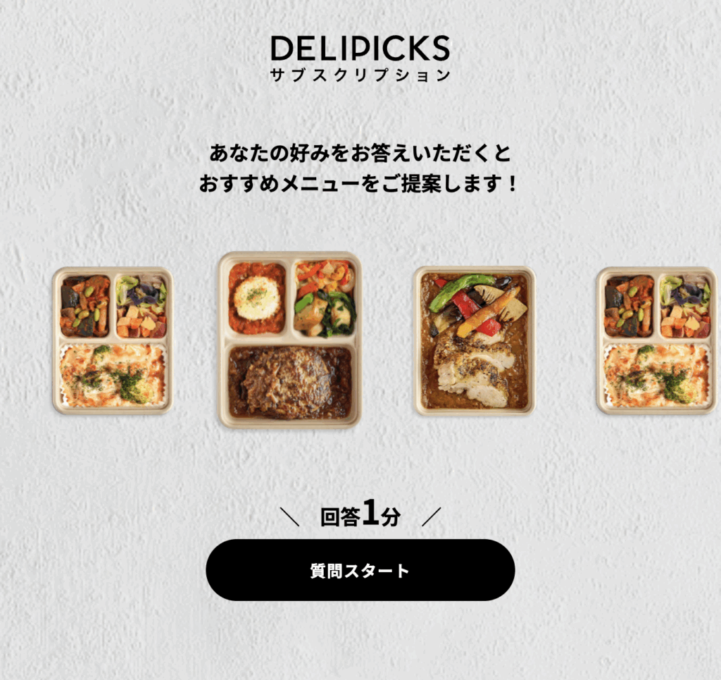 | スタイル | 【お弁当】×食数選択(6,8,10,20) 【お弁当】 主菜1品+副菜3品 | 【カテゴリー】×好きな食数 【カテゴリー】 お弁当:主菜1品+副菜2品 サイド:雑穀米など モーニング:オープンサンド マーケット:全国の冷凍グルメ ※最低注文金額:DELIPICKSオリジナル商品を5,000円以上(税抜) | 【お弁当】×食数選択(7,14,21) 【お弁当】 主菜1品+副菜2品 |