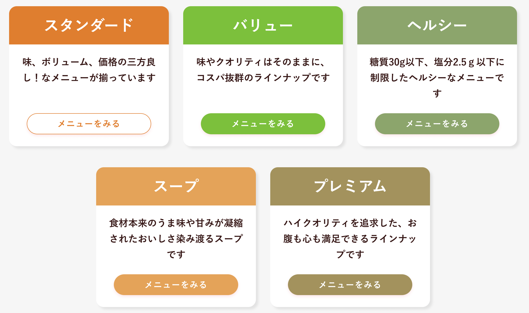 - 以下の5つのカテゴリー、合計100種類以上のメニュー(料金バラバラ)から